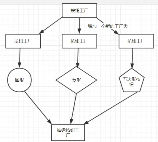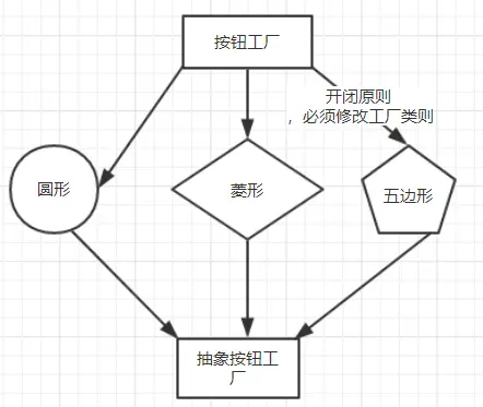 例如:一个系统,按钮工厂类可以返回一个具体的按钮实例,如圆形按钮、矩形按钮、菱形按钮等,在这个系统中,如果需要增加一种新类型的按钮,那、除了增加一个新的具体产品类之外,还需要修改工厂类的代码,这就使得整个设计在一定程度上违反了“开闭原则”。