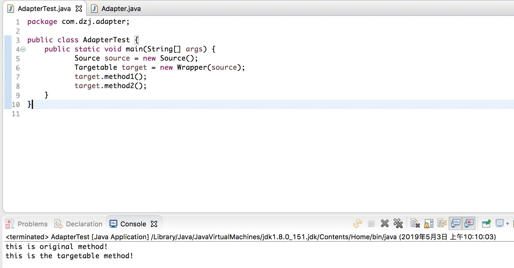 基本思路和类的适配器模式相同,只是将 Adapter 类作修改,这次不继承 Source 类,而是持有 Source 类的实例,以达到解决兼容性的问题。