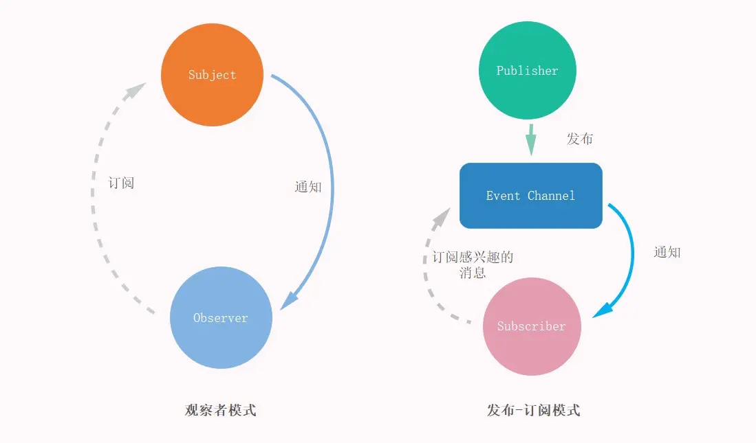 在观察者模式只有两种组件:接收者和发布者,而发布-订阅模式中则有三种组件:发布者、消息中心和接收者。