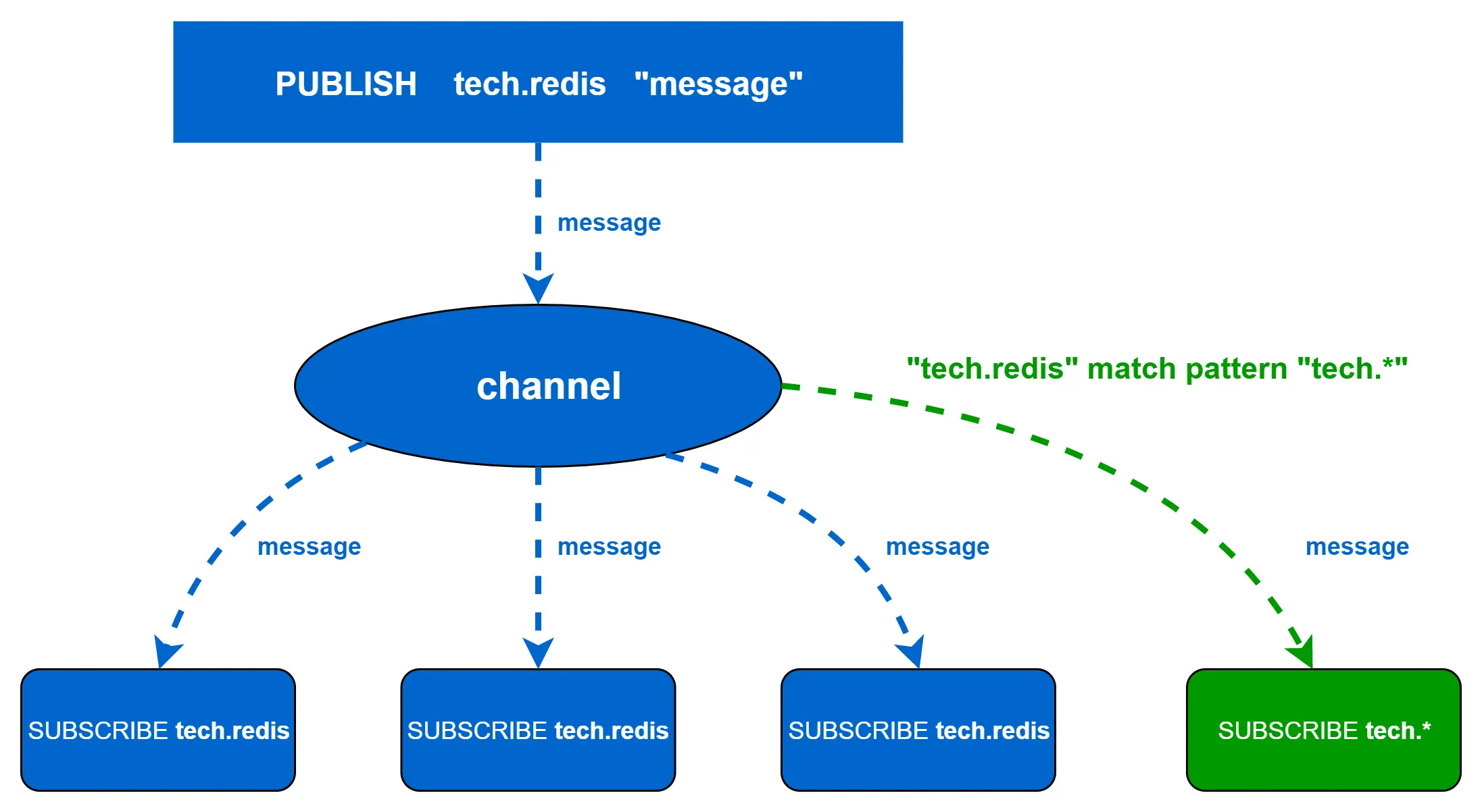 当调用 PUBLISH channel message 命令的时候,程序首先根据 channel 定位到字典的键,然后将信息发送给字典值链表中的所有客户端。