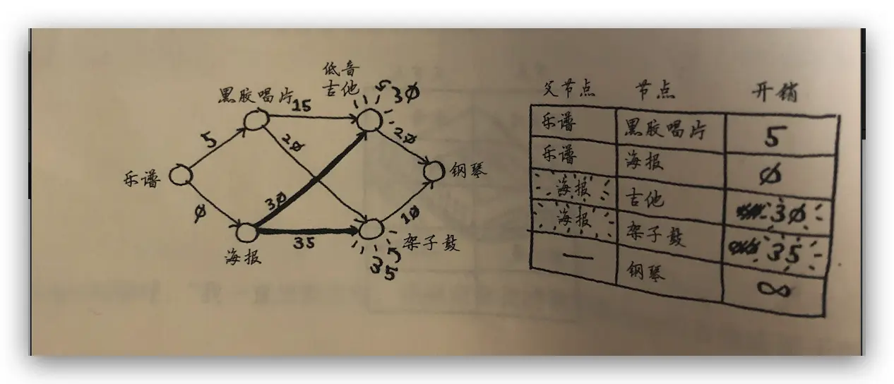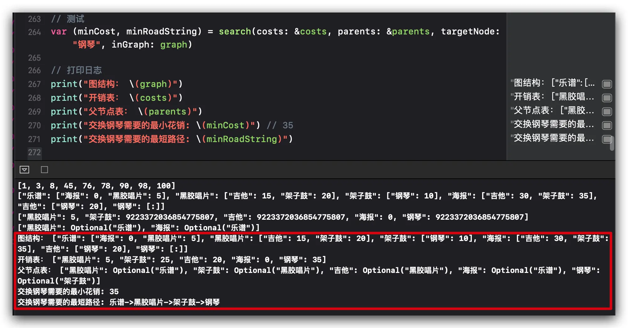 var (minCost, minRoadString) = search(costs: &costs, parents: &parents, targetNode: "钢琴", inGraph: graph)
