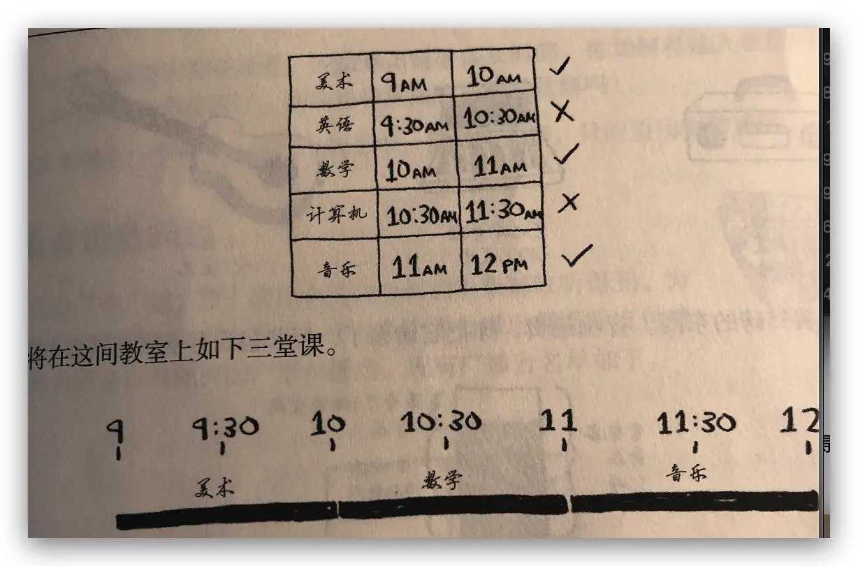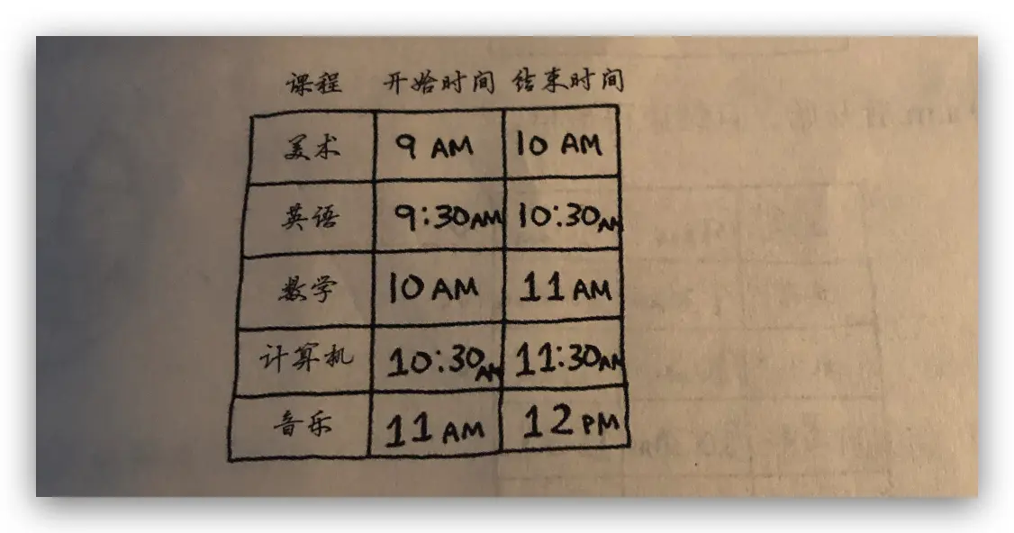 - 接着,选择第一节课结束后才开始的课,同样选择结束最早的课,这就是要在这件教室上的第二节课。重复这样做,就能找出答案。
