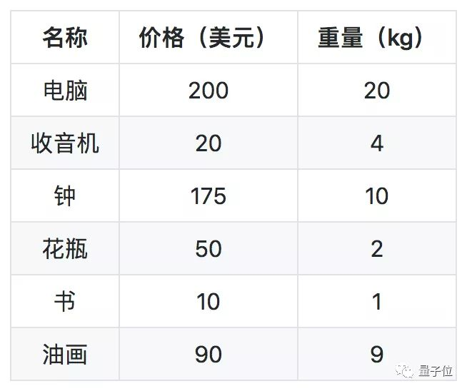 假设小偷有一个背包,最多能装20公斤赃物,他闯入一户人家,发现如下表所示的物品。显然,他不能把所有物品都装进背包,所以必须确定拿走哪些物品,留下哪些物品。