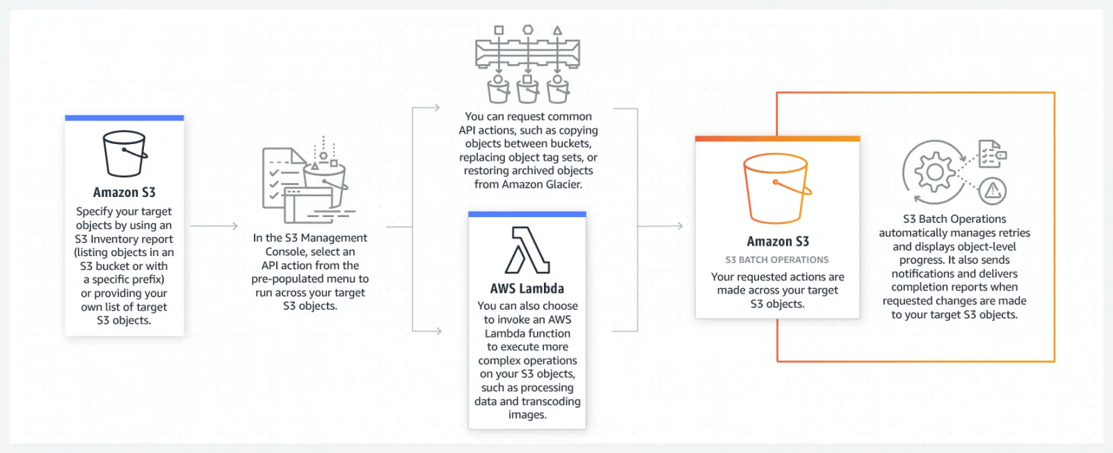 使用者不需要撰写程序代码,或是设置任何机群,只要透过点击按钮创建工作,S3会自动处理接下来的工作,用户除了可以使用S3控制台,也可以利用CLI或是API创建工作,并且监控与管理批次操作。而批次操作的工作,可以是将对象复制到另一个储存桶,设置标签或是修改访问控制列表,也可以在储存桶上呼叫AWS Lambda函式。相关内容提供:
