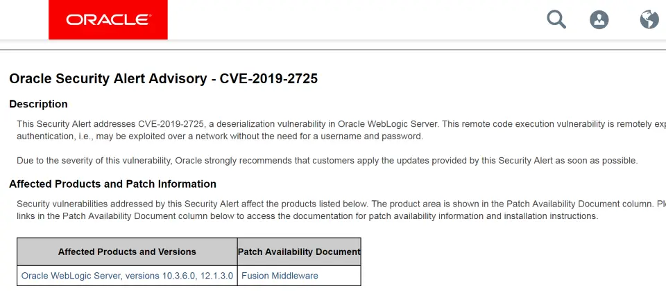 漏洞的高风险以及多起开采事件,迫使甲骨文4月26日释出例外修补程序,修补Database、Fusion Middleware、Oracle Enterprise Manager等产品。在安全公告中,甲骨文建议用户应及早规画更新。此外甲骨文也提醒,该公司只测试了涵括在付费支持或外延支持计划下的产品,但较早期版本也可能也受影响,建议用户升级到支持版本。