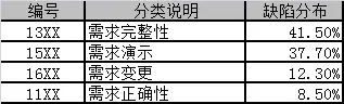 现在对上面10大类的的缺陷中的需求类的缺陷进行第二次挖掘,主要从四个方面对需求的缺陷进行分析:需求的完整性、需求的演示、需求变更和需求的正确性四个维度。分类后的缺陷分布见表。