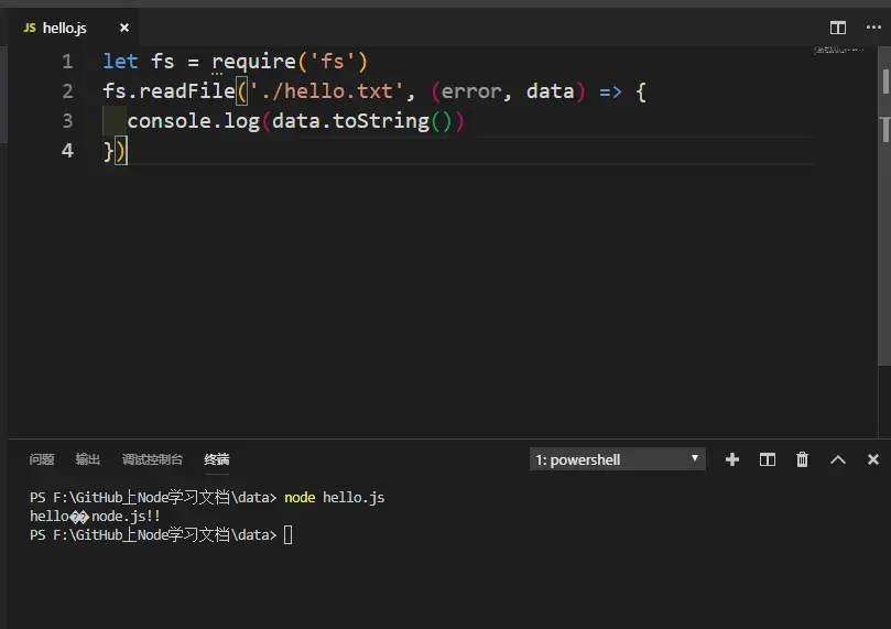 可以看到我们刚才在hello.txt中写入的文本hello, node.js!!已经打印出来。看到这里是不是觉得很牛叉,JavaScript居然可以用来读取文件内容,完全颠覆了我们以前对JavaScript的理解,然而这一切都得归功于Node.js。