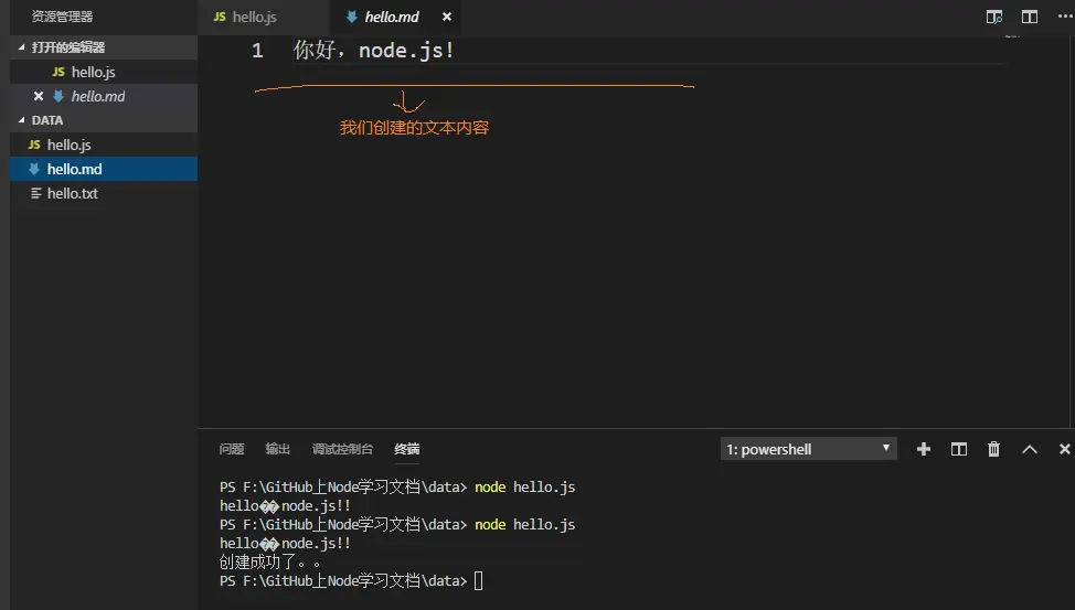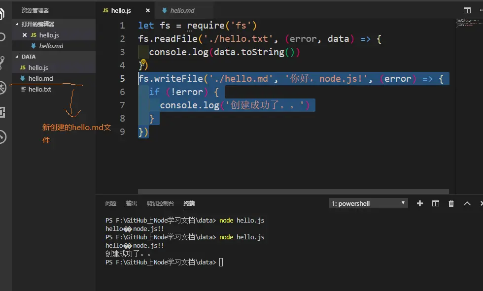 hello.js中写入下面这行代码:fs.writeFile('./hello.md', '你好,node.js!', (error) => { if (!error) { console.log('创建成功了。。') } }) // 写文件。writeFile接受三个参数:写入文件路径,写入内容,回调函数。 写入成功时候:error为null,写入失败时候:error为错误对象