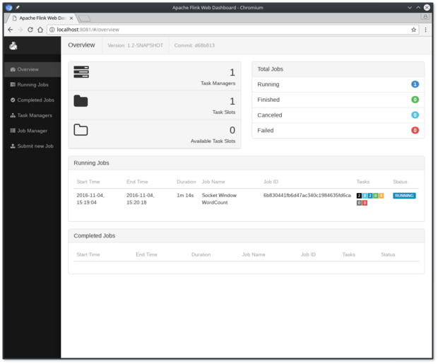 检查分派器的web前端在HTTP://本地主机:8081,并确保一切都正常运行。Web前端应报告单个可用的TaskManager实例。