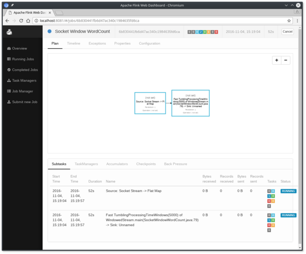 现在,我们将运行此Flink应用程序。它将从套接字读取文本,并且每5秒打印一次前5秒内每个不同单词的出现次数,即处理时间的翻滚窗口,只要文字漂浮在其中。