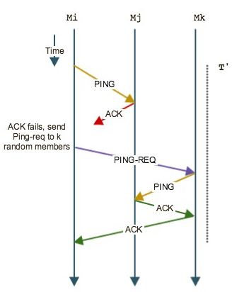 local node从alive nodes中随机选择K个node来对direct ping目标node进行indetect ping,这K个node会把结果forwards给这个local node,最后local node检查如果这个K个node没有一个返回ack,则将该目标node标记为failed,然后通过Membership update Dissemination将该node的FAILED信息传播到网络中的其他node