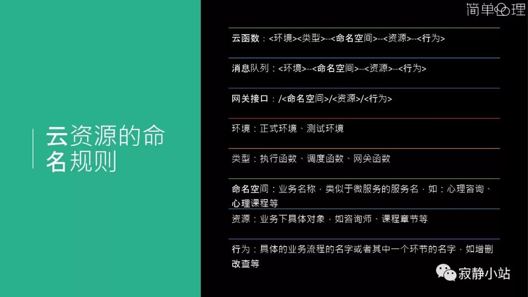 首先是命名规则,命名规则的作用是管理大量的云资源的,这个云资源包括云函数、云消息队列、云网关接口等等。通过命名规则,将这些云服务融为一体进行开发和使用。