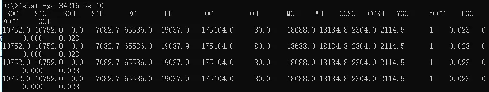 样例:表示每5秒钟查看一次LVMID为34216的虚拟机进程的GC情况,一共查询10次