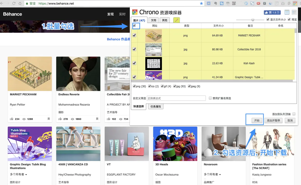 - 批量勾选需要下载的图片, 开始下载