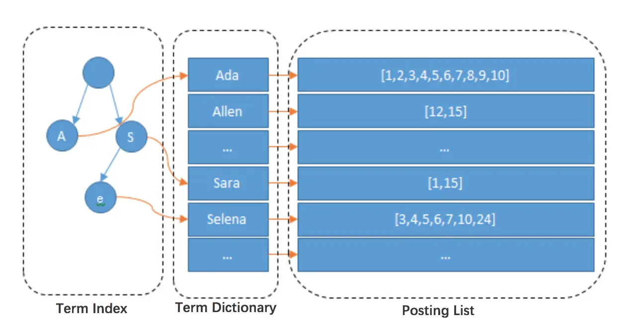 如上,Elasticsearch分别为每个field都建立了一个倒排索引,Kate, John, 24, Female这些叫term,而1,2就是Posting List。Posting list就是一个int的数组,存储了所有符合某个term的文档id。在ES的每一部分中都采用了一些优化及压缩技术,例如Term Index采用类似字典的索引页的方式,可以理解为一棵树,Term Dictionary存储block,从Term Index找到对应的节点后再去Term Dictionary中寻找对应的block,从而磁盘去寻找Term。