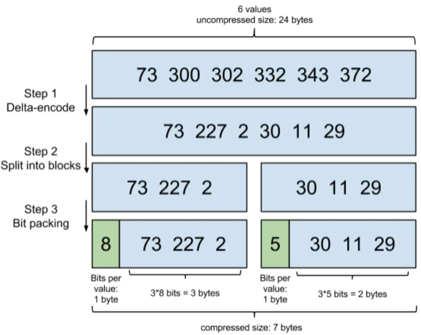 这样简化存储后,ES仍然没有满足,为了将Term Index、Term Dictionary及Posting List存储入内存,Term Index使用了FST的压缩,Posting List采用:增量编码压缩,将大数变小数,按字节存储的方式进行压缩。