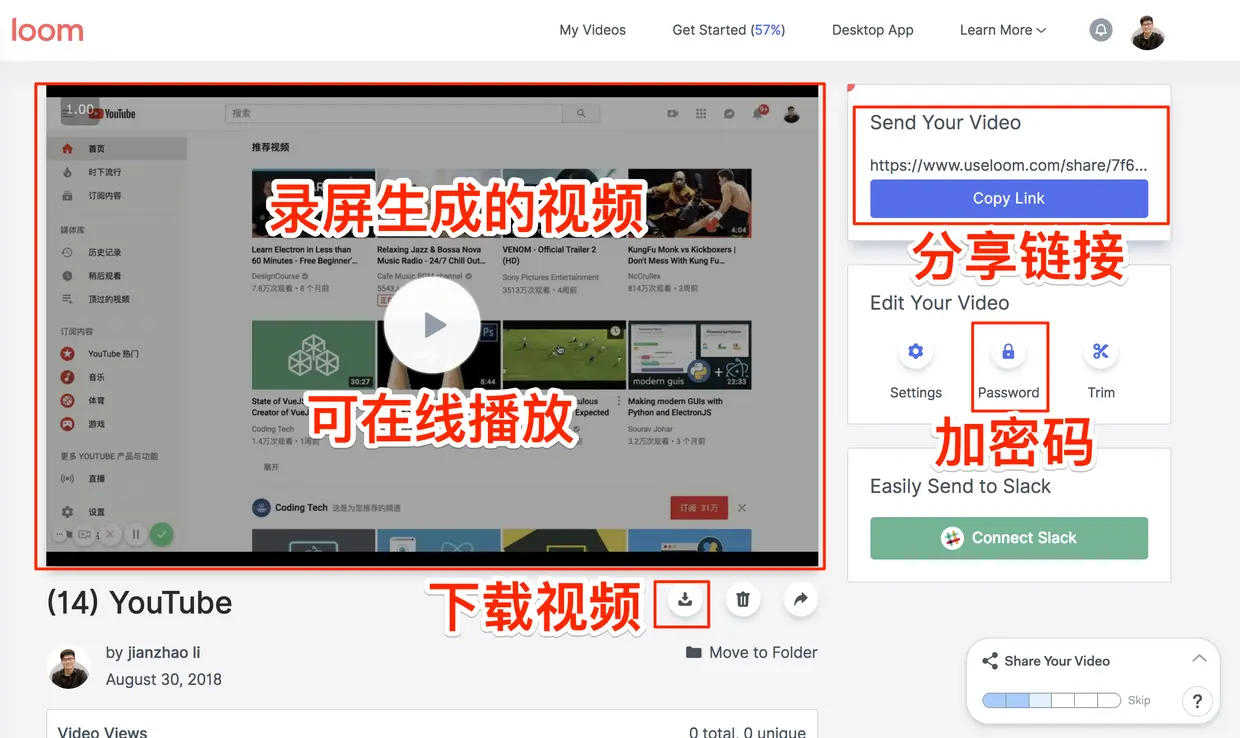 - loom可以一键录制浏览器的单个标签页(盗版翻录视频的神器), 录制完成后自动生成在线网页,进行视频播放, 可以下载刚刚录制的视频, 也可以为刚刚生成的在线视频设置密码(盗版录屏加发布一条龙服务)