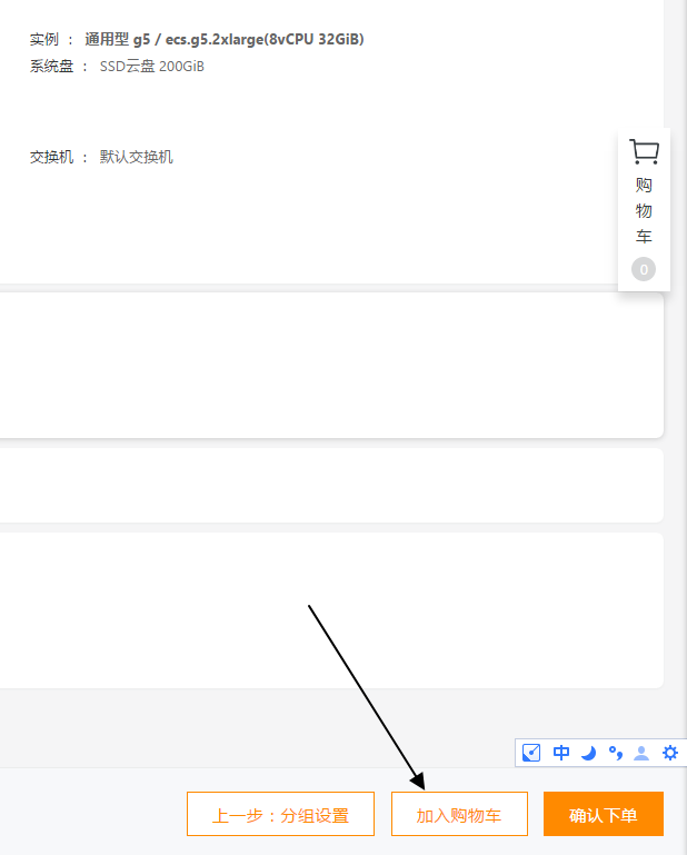 活动页面地址:点我进入 - 在选购页面将选定的ECS加入购物车,我们这里以8核32GB 200GB云服务器ECS(官方报价:11200元)为例。