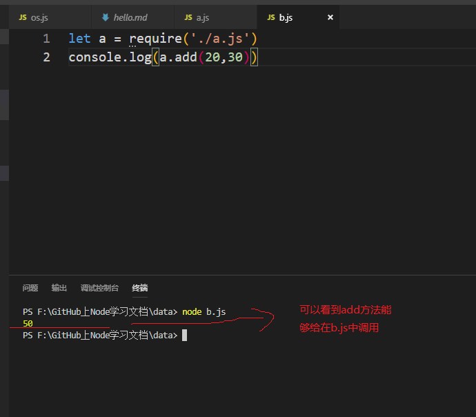 此时,在b.js中如果需要使用add方法,只需引入a.js即可。b.js代码如下: