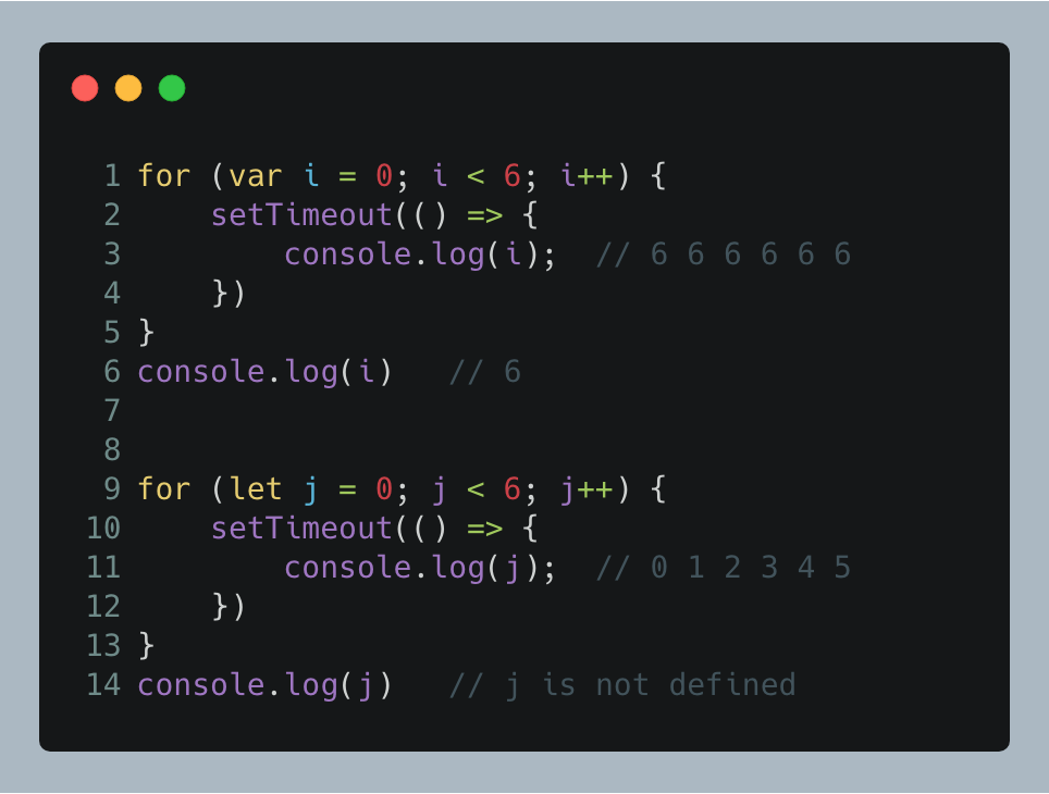 - 上面代码中,变量j是let声明的,当前的j只在本轮循环有效,所以每一次循环的j其实都是一个新的变量,那么如果每一轮循环的变量j都是重新声明的,那它怎么知道上一轮循环的值,从而计算出本轮循环的值?这是因为 JavaScript 引擎内部会记住上一轮循环的值,初始化本轮的变量j时,就在上一轮循环的基础上进行计算。