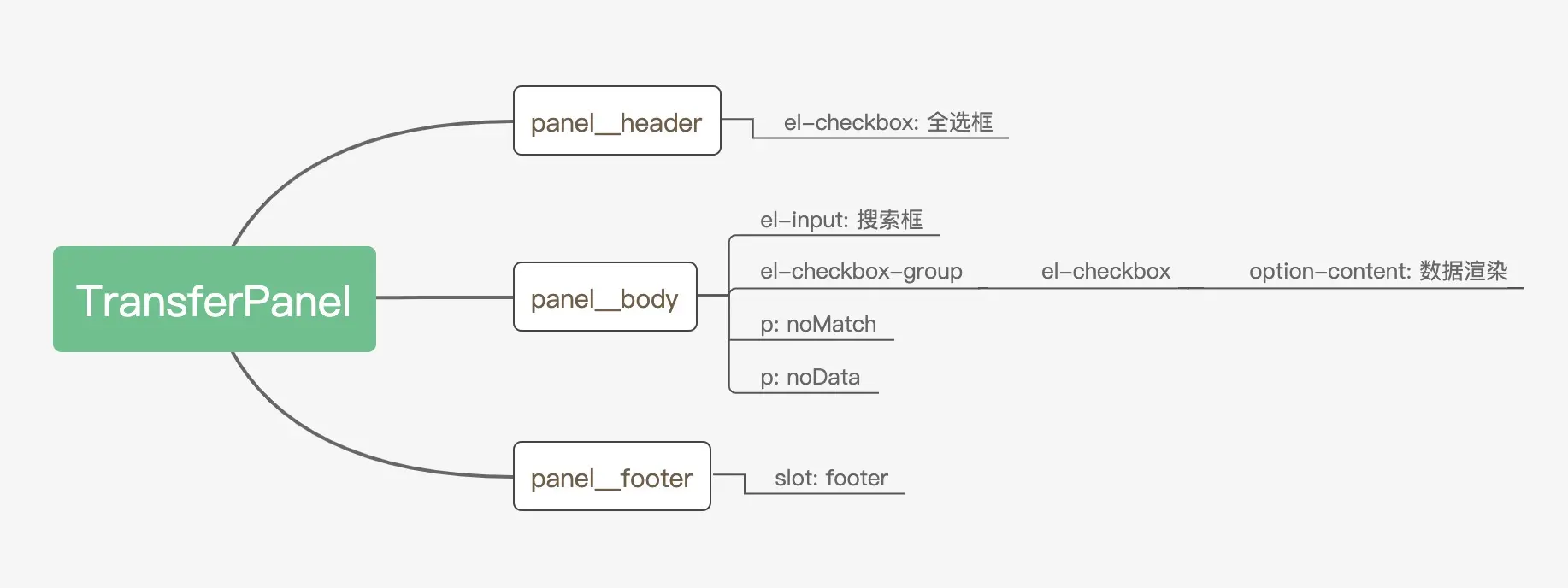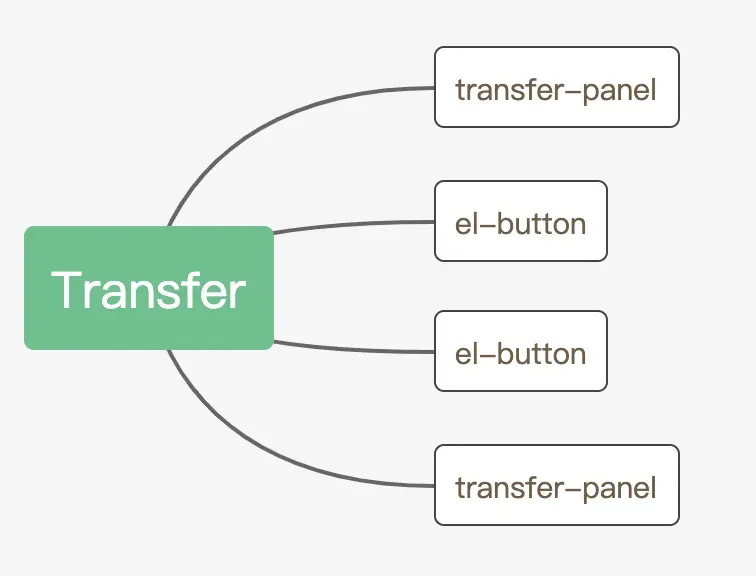 整体上,可以划分为左中右三块,左右两个 TransferPanel 组件承载数据展示。中间两个 ElButton 是左右移动的操作按钮。结构清晰。