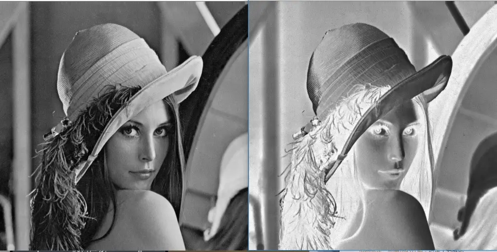 在进行图像增强时,上述的线性变换函数用的较多的就是图像反转了,根据上面的参数,图像反转的变换函数为:s=255−s。图像反转得到的是图像的负片,能够有效的增强在图像暗区域的白色或者灰色细节。其效果如下: