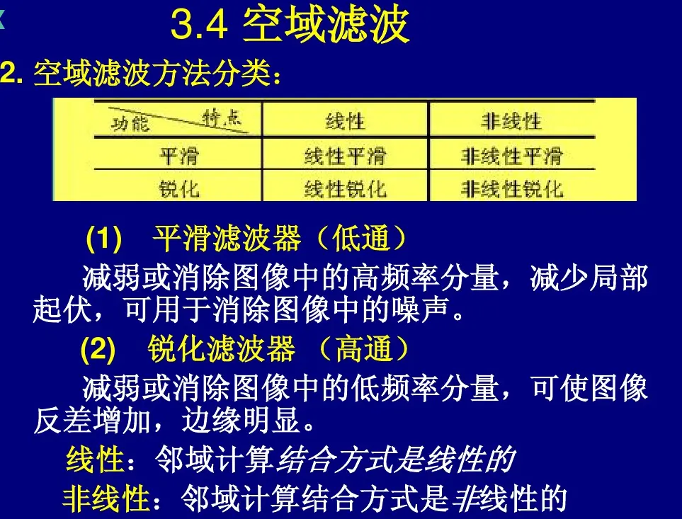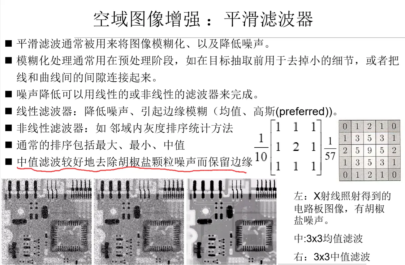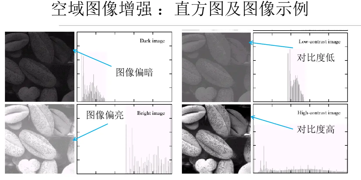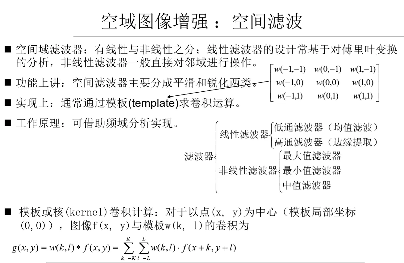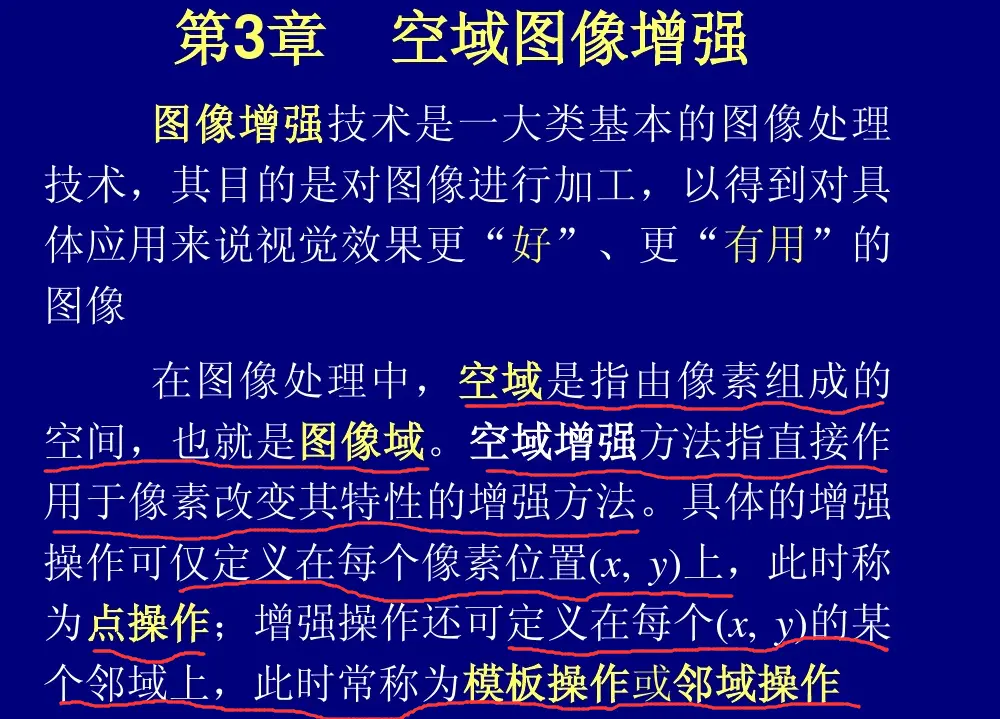 空域增强是直接对图像空间中的像素灰度进行处理,包括:灰度变换、直 方图处理、空间滤波、图像卷积等。