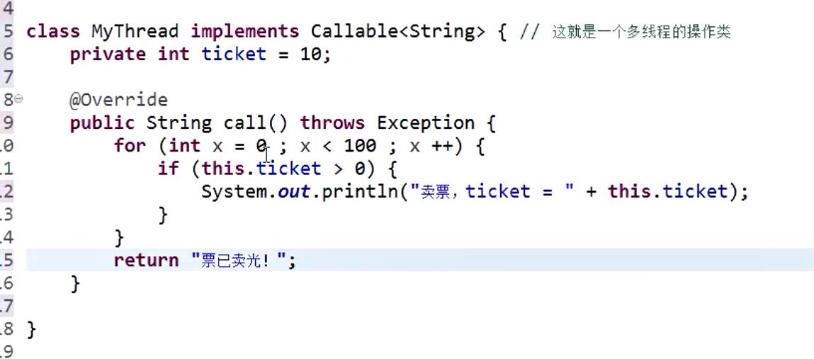 我们是想线程运行完会返回一个 “票已卖光!”的字符串。好,测试代码写好,我们开始启动线程。