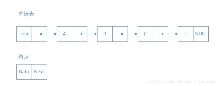 上面有讲,链表是通过指针将一组零散的内存块串联在一起,其中这个内存块我们称之为链表的结点。为了将所有的结点串起来,每个结点除了存储数据之外还会记录链表上下一个结点的地址,这个记录下一个结点地址指针称作后继指针next。单链表如下图: