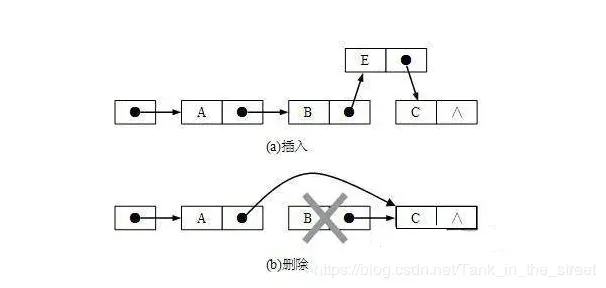 不过链表比数组多了一个有点就是链表在执行增加和删除操作的时候所要消耗的时间复杂度比数组小很多。由于数组是用连续的内存空间来存储数据,当执行删除或者增加操作的时候,为了保证数组空间的连续性,就必须对指定添加位置或者删除位置后面的数据进行数据迁移。而链表由于不是连续的内存空间来存储数据,并且链表当中的结点是知道下一个结点的内存地址,当我们执行添加操作的时候就只需把当前结点next指针指向要插入的数据,要插入的数据的next指针指向原来当前结点的下一个结点内存地址即可。同理在执行删除操作的时候只需把当前要被删除结点的上一个结点next指针指向被删除结点的下一个结点即可。由于增加和删除操作不需要对被操作结点后面数据进行迁移,所以增加和删除操作的时间复杂度都为O(1)。图解如下: