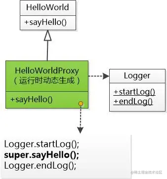 动态生成的代理类,在代理方法中 调用了父类(目标类)的目标方法,并在调用前后做了一些处理。