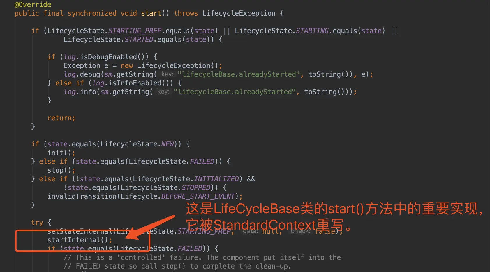 答:其实它调用了生命周期实现方法LifeCycleBase.start()方法。而LifeCycleBase的start()中的startInternal()被StandardContext.startInternal重写。我们的WebAppClassLoader就在这里被关联。