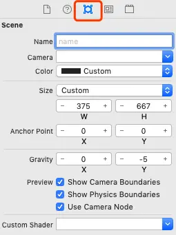 b.找到 GameScene.sks,将 helloWorld 的 label删除掉,然后将宽高调整为 W:375 H:667, 锚点设置为 X:0 Y:0,重力设置为X:0 Y:-5