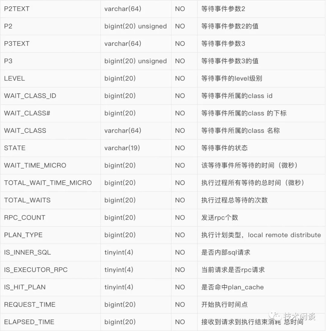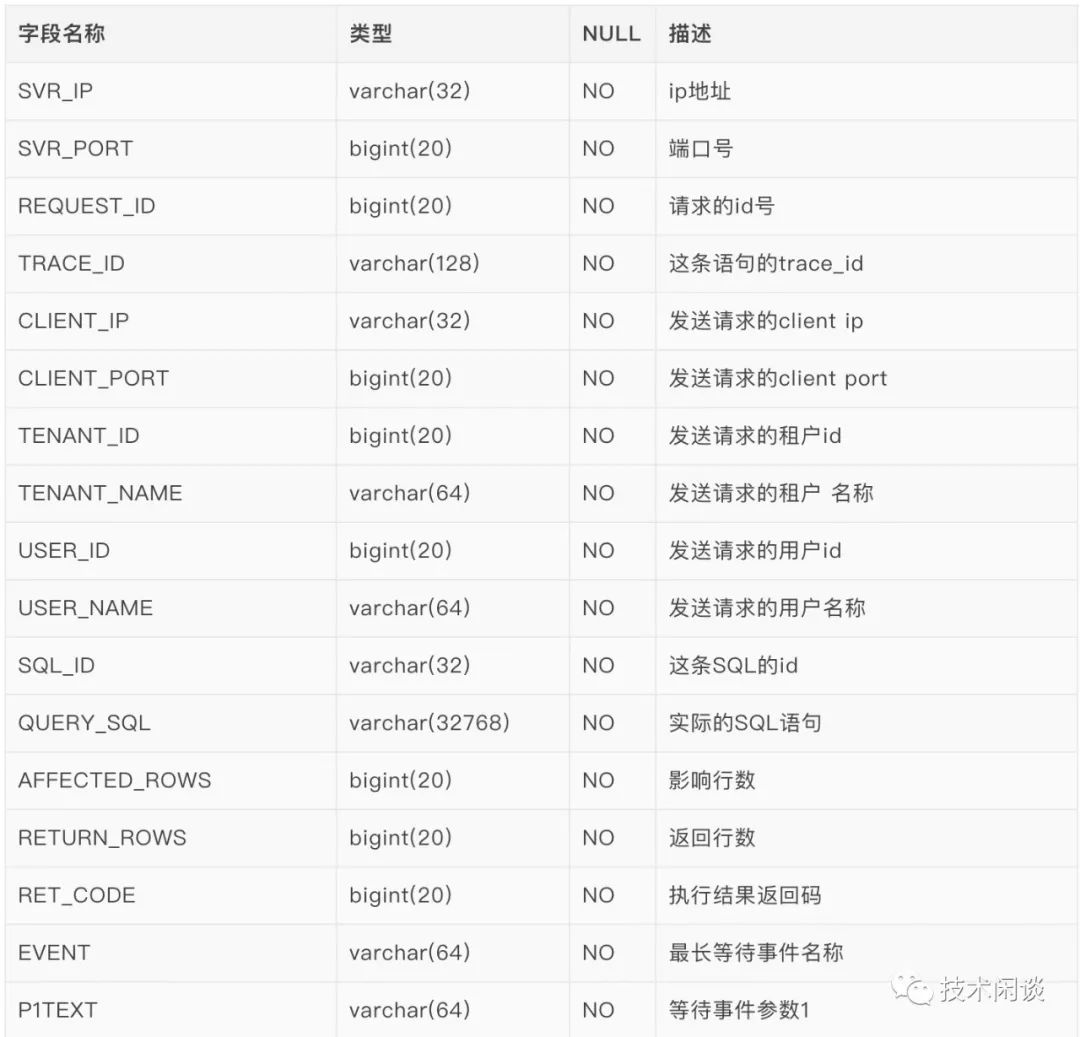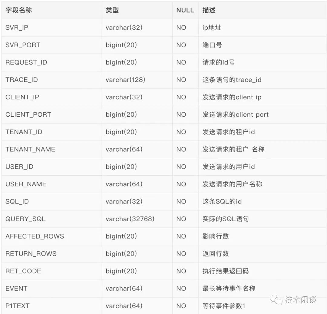 OceanBase的SQL审计视图(gv$sql_audit)包含了SQL文本以及执行的详细信息,如执行节点、总耗时、等待时间、服务时间、逻辑读、影响行数、等待事件及其参数和其他信息,内容非常丰富。如下图