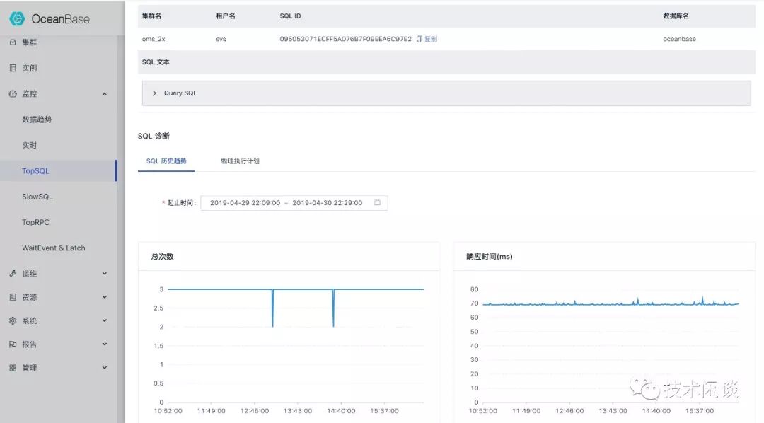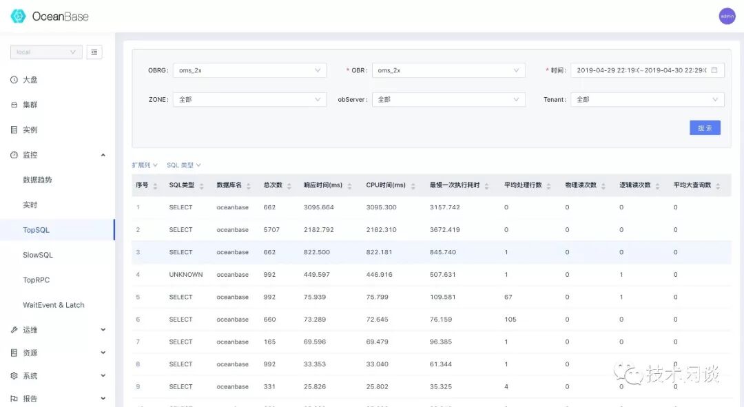 同样,OCP采集了各个OceanBase集群的SQL审计信息后也提供页面可以查看TOP SQL信息,并提供SQL性能分析下钻功能。