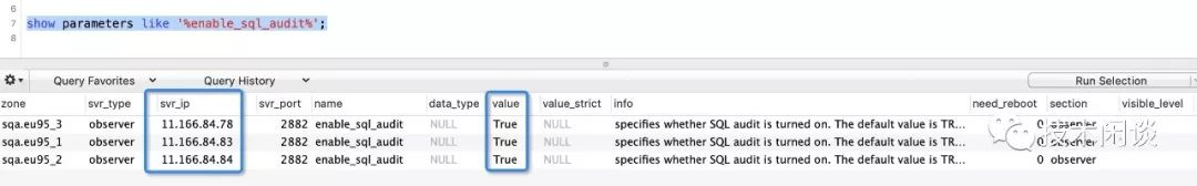 OCP)也会部署监控客户端定时拉取这个性能数据用作后面分析。OceanBase的SQL审计功能由参数(enable_sql_audit)控制,可以针对每个节点设置是否开启。默认值是开启的( true)。同样即使在蚂蚁双11大促期间,这个参数也可以不关闭,由此可见开启这个对性能并没有什么影响。