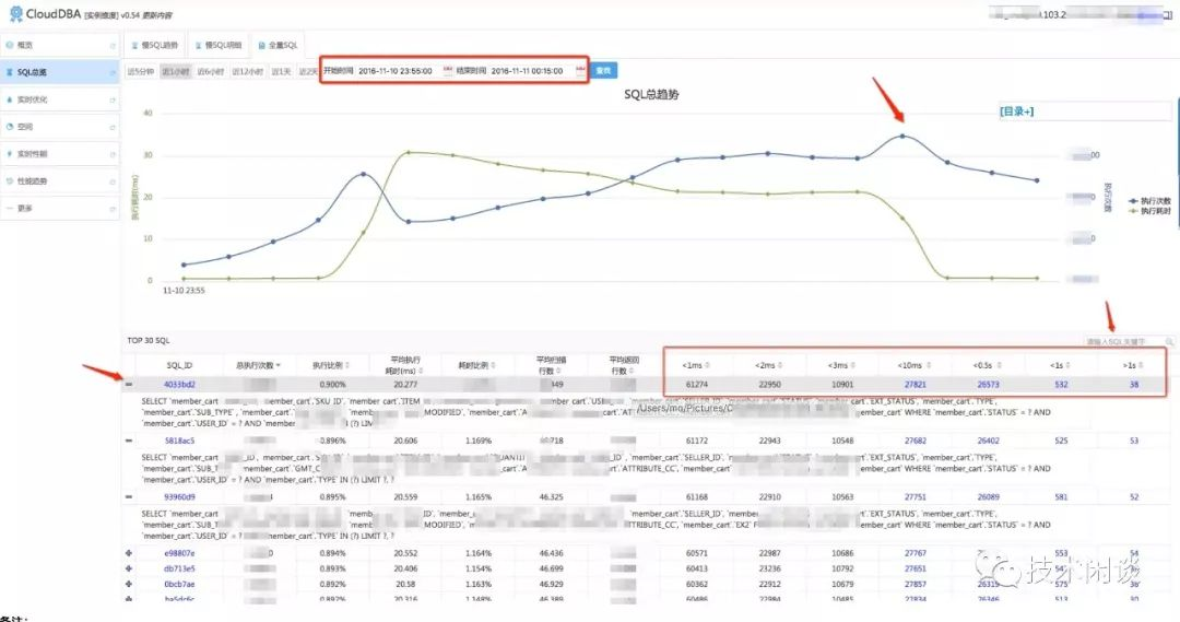 下面是CloudDBA曾经某个版本的一个功能示意图。能看到全部SQL的QPS和RT,以及每个SQL在不同区间的分布状况。