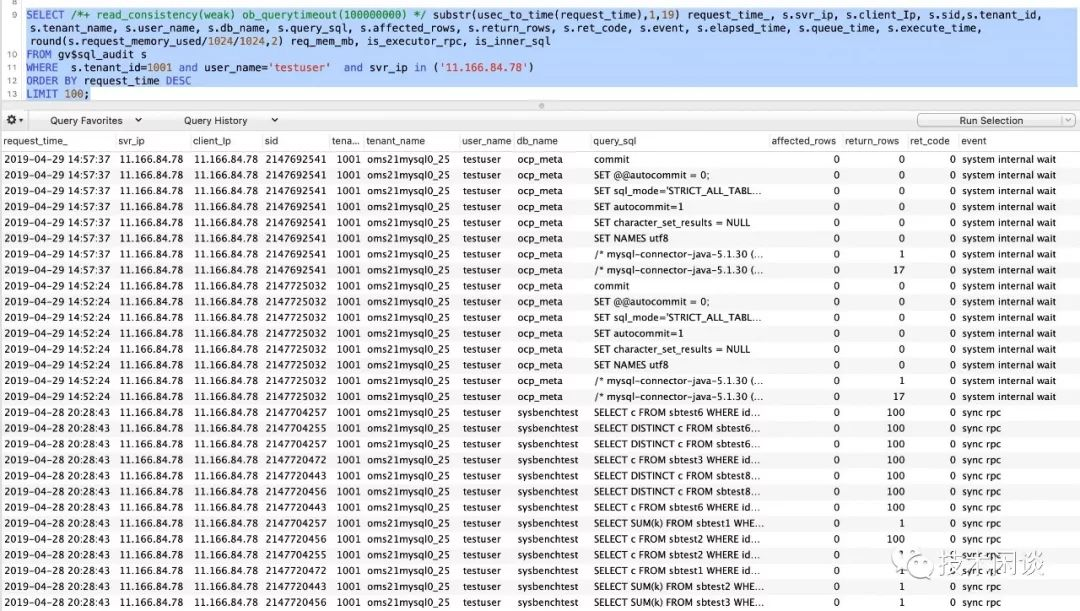 SELECT /*+ read_consistency(weak) ob_querytimeout(100000000) */ substr(usec_to_time(request_time),1,19) request_time_, s.svr_ip, s.client_Ip, s.sid,s.tenant_id, s.tenant_name, s.user_name, s.db_name, s.query_sql, s.affected_rows, s.return_rows, s.ret_code, s.event, s.elapsed_time, s.queue_time, s.execute_time, round(s.request_memory_used/1024/1024,2) req_mem_mb, is_executor_rpc, is_inner_sqlFROM gv$sql_audit sWHERE s.tenant_id=1001 and user_name='testuser' and svr_ip in ('11.166.84.78')ORDER BY request_time DESCLIMIT 100;