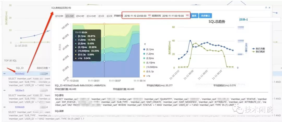 进一步点击SQL前面的id值,显示该SQL的不同时间段的执行时间RT分布。