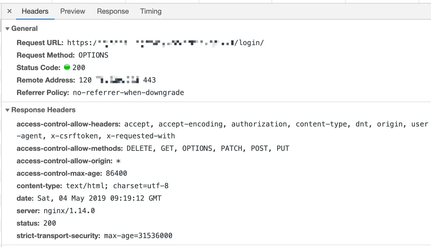 也就是说:在你发送请求的时候,浏览器会自己先发送一个预检请求。后台只需要识别请求的方法「OPTIONS」,然后返回一些信息。 如下图: