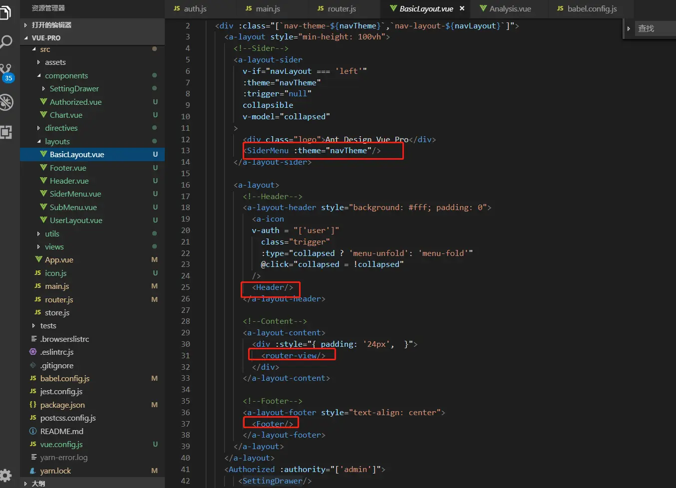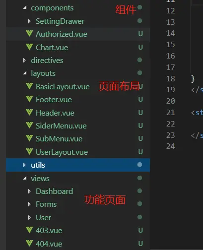 总结下分为三部分:用户模块、主要内容、403/404页面。 用户下面有子模块login,主要内容(一般是导航菜单的内容)有仪表盘dashboard和表单form,仪表盘下面有分析页anlysis,表单下面有基础表单basicForm