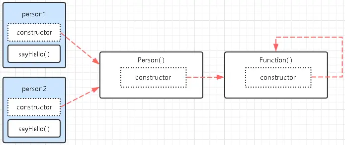 首先,我们已经知道每个对象都可以通过对象.constructor指向创建该对象的构造函数。我们先假设每个对象上都有这么个constructor属性,然后理解如下:
