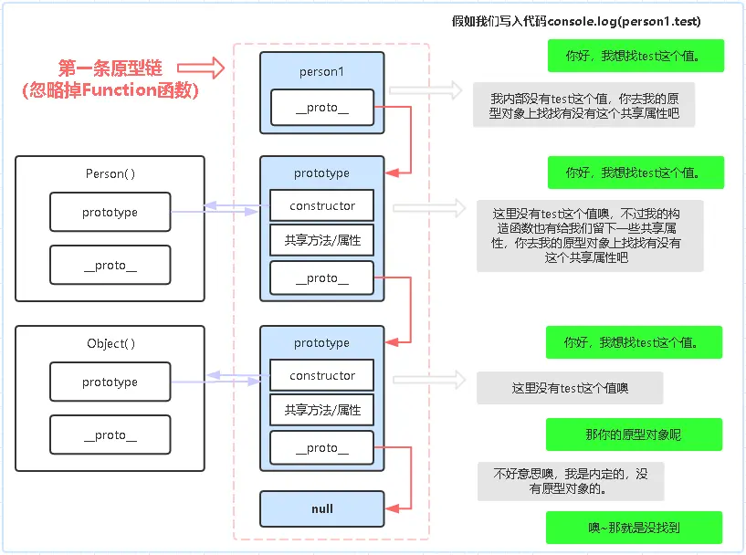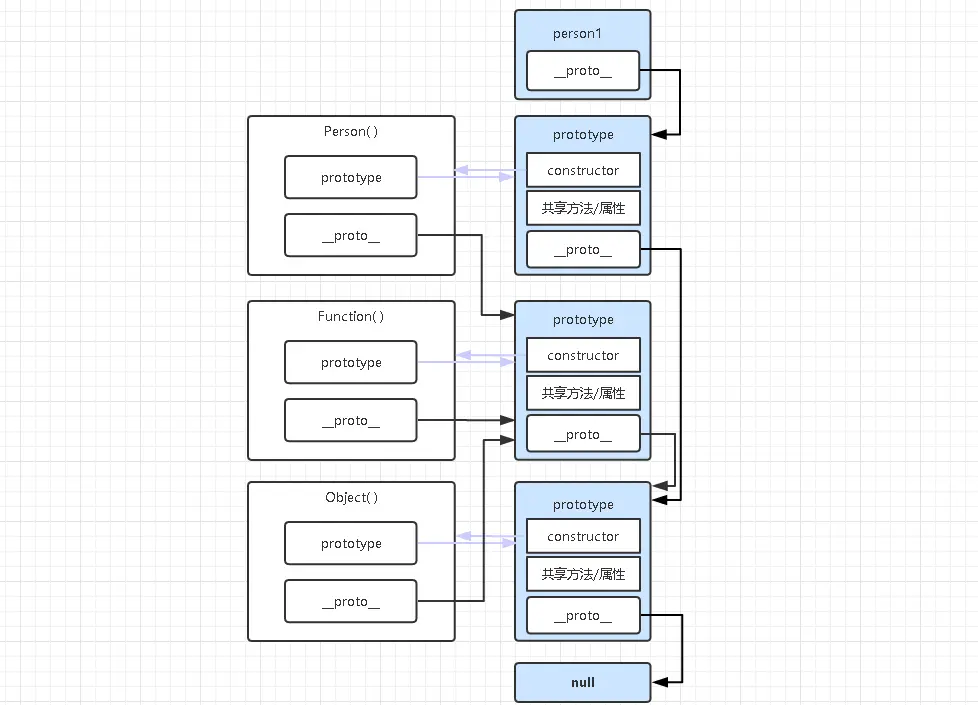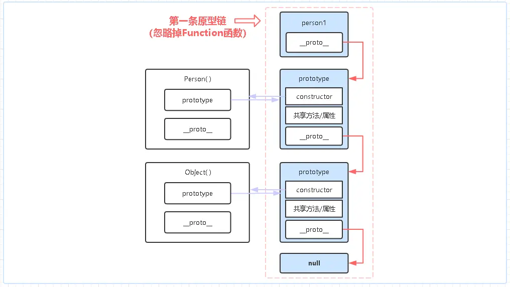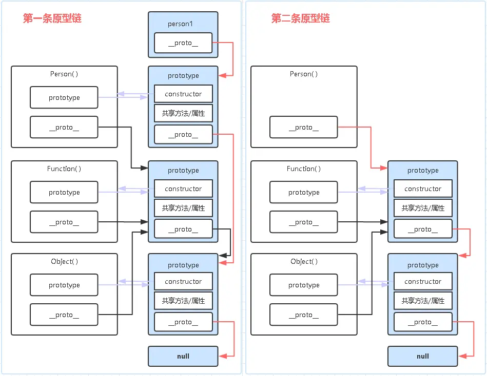 右边的图:之前说过Person函数(所有函数)其实是Function函数的实例,假设把它看成一个普通的实例对象,忽略它函数身份以及prototype对象,其实它和左边图中的person1没什么区别,只是它们的__proto__属性指向了各自的的原型对象。