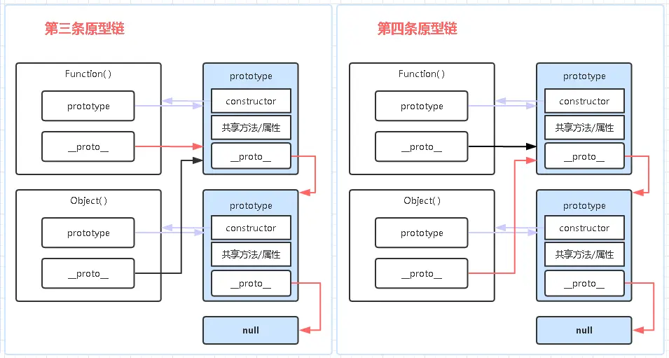 这是由于Object函数的特殊性,有人会想,为什么Object函数不能像Function函数一样让__proto__属性指向自己的prototype?答案就是如果指向自己的prototype,那当找不到某一属性时沿着原型链寻找的时候就会进入死循环,所以必须指向null,这个null其实就是个跳出条件。