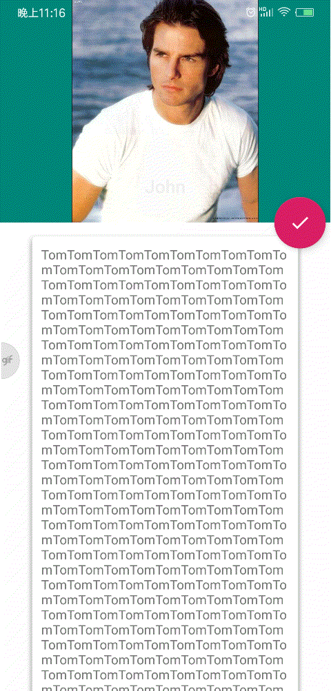 当CollapsingToolbarLayout滑动到一个确定的阀值时,状态栏显示或隐藏纱布,你可以通过 app:statusBarScrim或者setStatusBarScrim(Drawable)来设置纱布图片。(可以时图片也可以是 颜色)