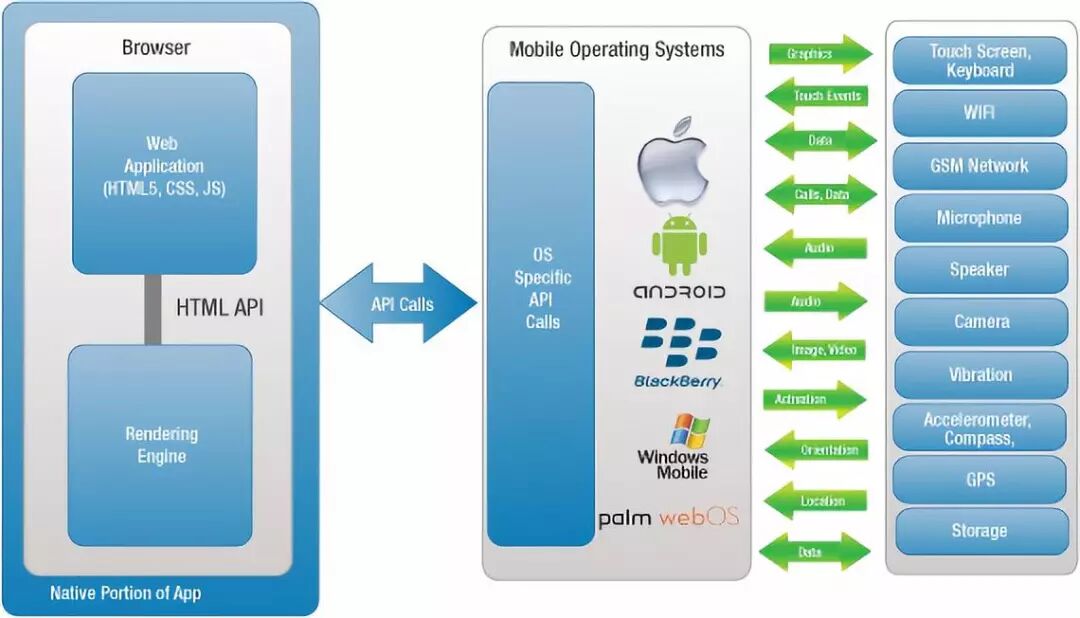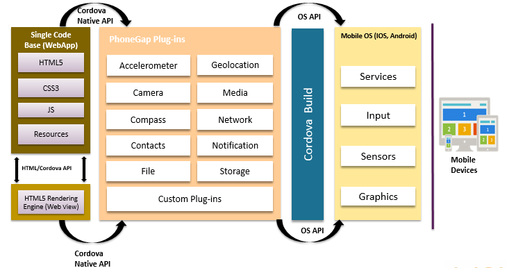 Cordova 的重点是定义了一套用 HTML、CSS 以及 JavaScript 技术来编写应用程序的规则,”一次开发,多端使用“的目的。与 Hybrid 技术类似的是,Cordova 也实现了一套自己的桥,方便开发者可以调用起硬件来获取信息。其技术架构如下所示: