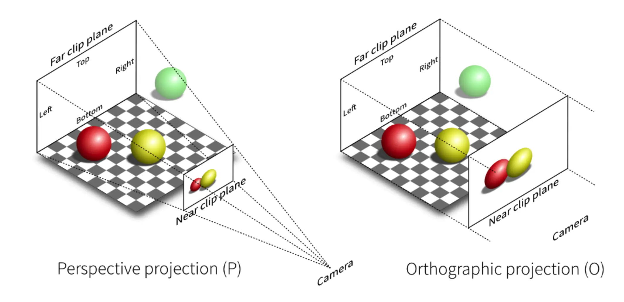 左侧是PerspectiveCamera(透视相机),这符合我们正常人的视野,近大远小,对应的是投影中的透视投影。