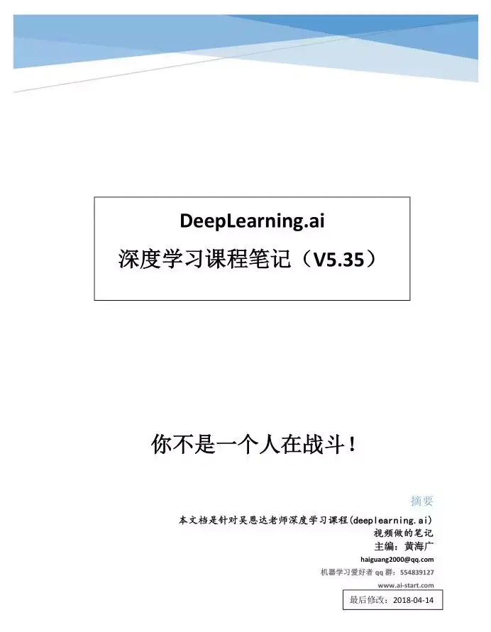 深度学习入门首推课程就是吴恩达的深度学习专项课程系列的 5 门课。该专项课程最大的特色就是内容全面、通俗易懂并配备了丰富的实战项目。今天,给大家推荐一份关于该专项课程的核心笔记!这份笔记只能用两个字形容:全面!