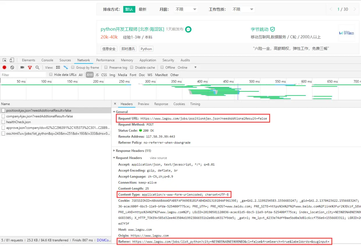 Chrome浏览器右键检查查看network,找到链接https://www.lagou.com/jobs/positionAjax.json?needAddtionalResult=false