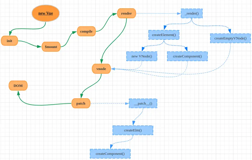 _render函数将组件对象转化为一个VNode实例;而_render是通过调用createElement和createEmptyVNode两个函数进行转化; createElement的转化过程会根据不同的情形选择new VNode或者调用createComponent函数做VNode实例化;- 完成VNode实例化后,这时候Vue调用原型上的